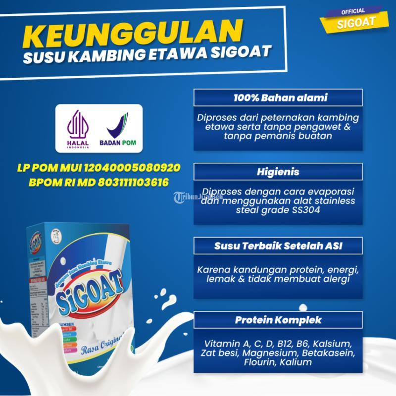 Susu SiGOAT merupakan susu kambing etawa bubuk yang berkhasiat untuk menjaga kesehatan dan meningkatkan imunitas tubuh, dapat membantu menambah tinggi badan dan berat badan. Baik untuk tulang dan persendian serta sistem percenaan. Silahkan konsultasi terlebih dahulu kepada admin melalui chat.