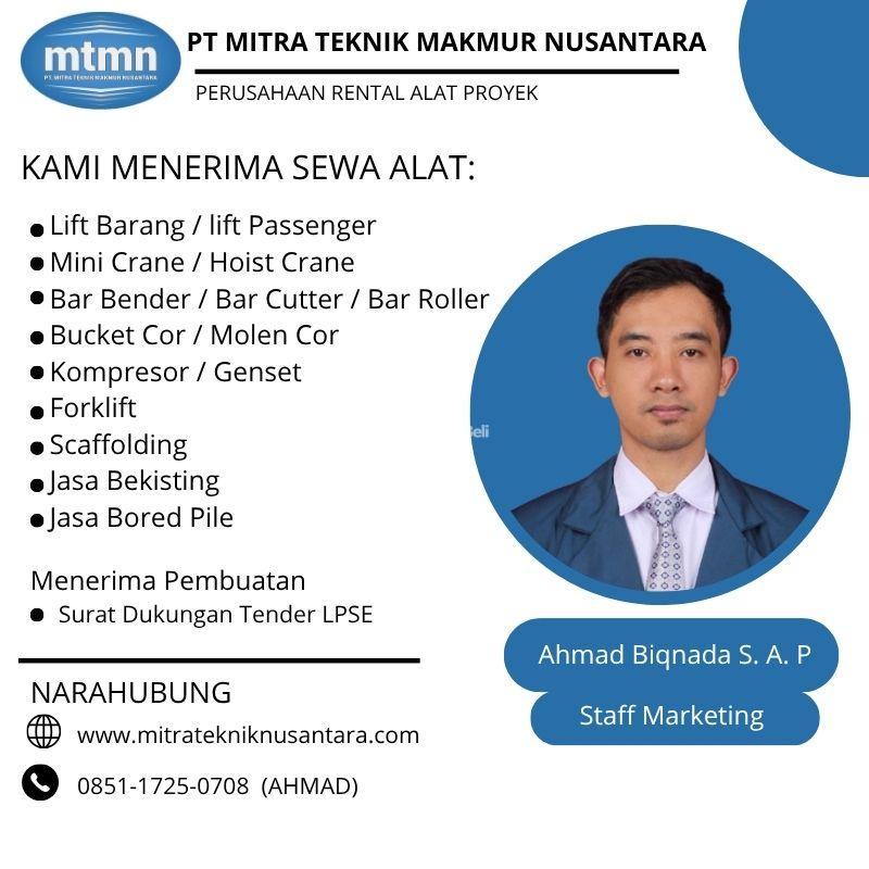 PT. Mitra Teknik Makmur Nusantara adalah penyedia jasa sewa alat proyek yang berpengalaman dalam mendukung percepatan pembangunan. Kami telah dipercaya oleh berbagai kontraktor di bawah naungan BUMN maupun swasta, dengan proses layanan yang cepat dan penawaran harga terbaik. Kami melayani pemesanan untuk seluruh wilayah Indonesia.
